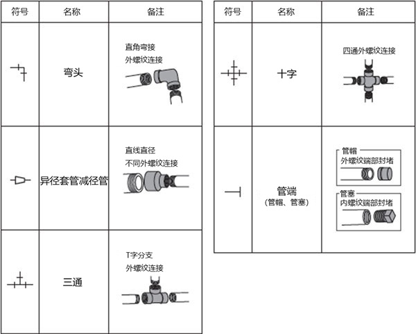 管接头符号基本上与螺纹连接符号相同,但管道末端的管帽和管塞也使用与管接头部分相同的短线符号。