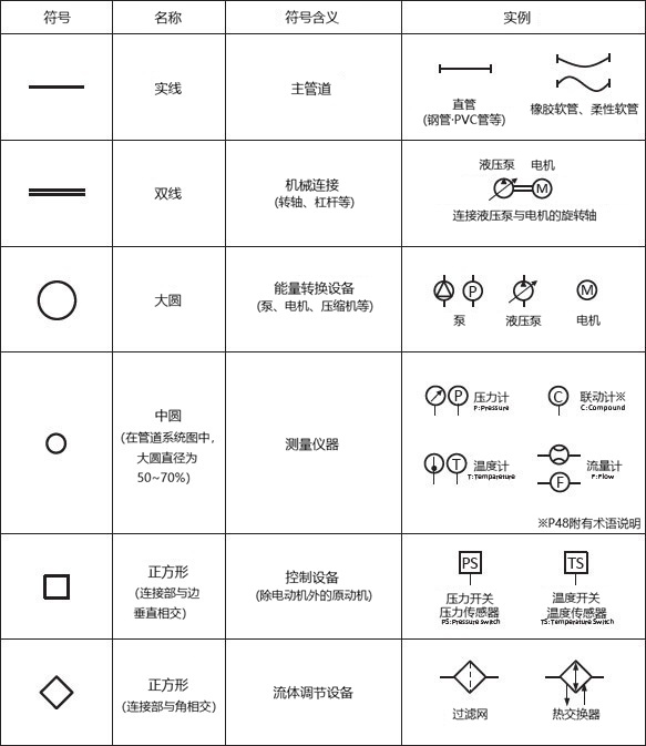 例如,管道是实线,但如果它是双线,它将成为诸如旋转轴之类的连接设备,即使是相同的圆圈,大圆圈表示能量转换器,小圆圈表示测量仪器。需要注意不要混淆相似的符号。