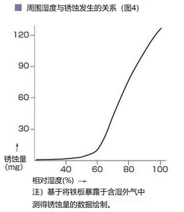 控制设备有许多连接部分。然后,接合部的大敌是湿气。图表 (4) 为“腐蚀与相对湿度的关系”,可知腐蚀速度超过60%后加速。通常,日本70%的湿度是常识水平,因此控制设备的湿度措施非常重要。此外,据说温度越高,腐蚀就越严重,湿度对策被认为是必须与热对策同时考虑的课题。