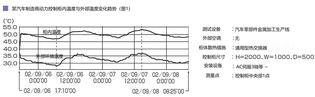 数据证明,热量会显著加速半导体和电子元件的故障率,并缩短其使用寿命。图1显示了某汽车制造商控制柜内外的温度变化。在整个测试过程中,温差约为15至20摄氏度。