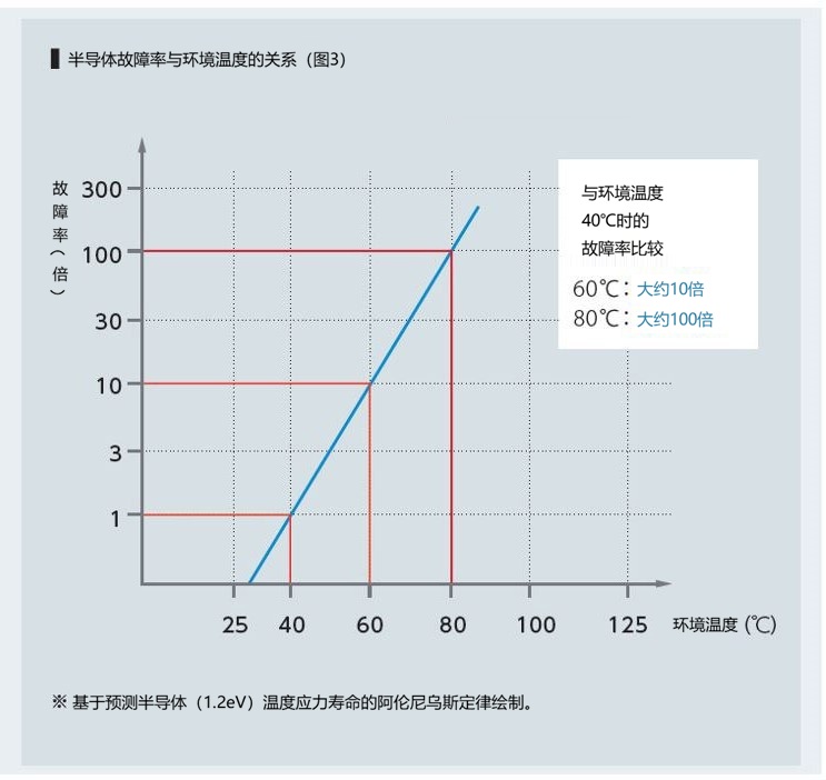 此外,图 (3) 显示了半导体故障率与环境温度之间的关系,并且被称为“阿雷尼乌斯定律”。结果表明,在30°C或更低的温度下,故障率非常小,而在40°C的温度下,故障率为1。当温度达到60°C时,它从10倍增加到接近30倍,并且在80°C下它从100倍增加到接近300倍。由于温度上升,半导体、电子部件的故障率飞跃性增加。