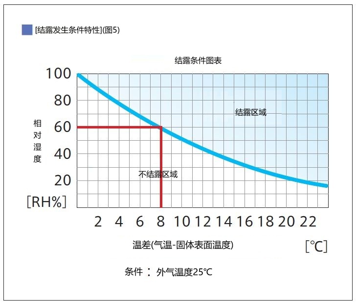 上一页我们提到了点式空调的排气温度较低,但有些人可能想知道控制柜空调是否也存在同样的情况。据说典型的点式空调排气温差(控制柜空调,并在日本夏季典型的温湿度条件下使用,则可能会出现结露。(图⑤)