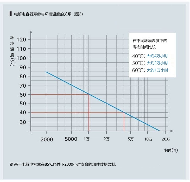在盘内温度为5 5°C或6 0°C的盘内,如图 (2) 所示,电子设备中使用的电容器的寿命大大缩短。