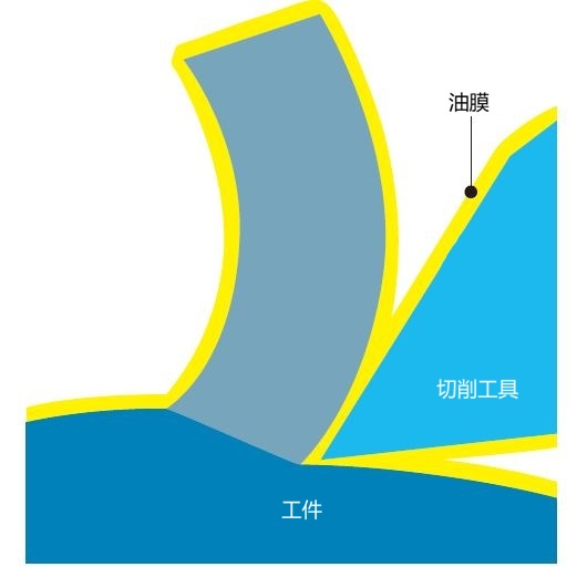 因此,通过分别向工具和工件供给切削液,在金属表面形成油膜,可防止金属直接接触,减轻摩擦和磨损。这是切削液的润滑作用。
