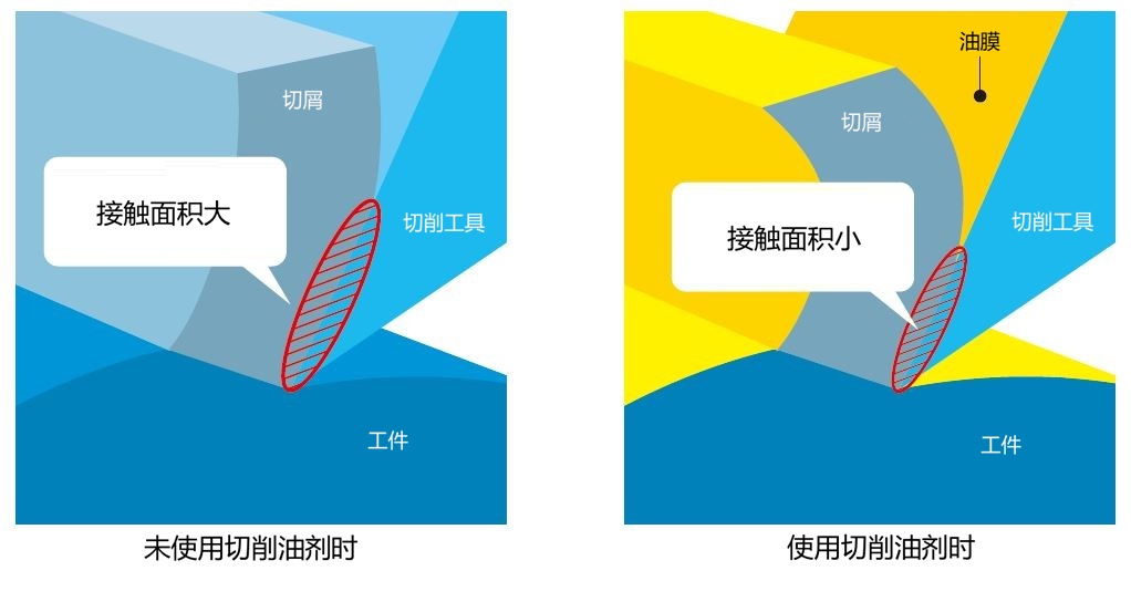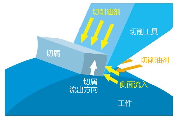 对金属进行切削加工时也是同样的道理,通过边施加液体边进行切削,工件与工具、工具与切屑之间的摩擦减少,可顺利进行切削,还可抑制工具及被切削材料的磨损。