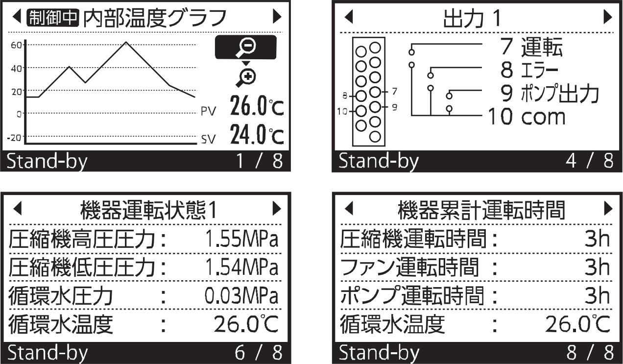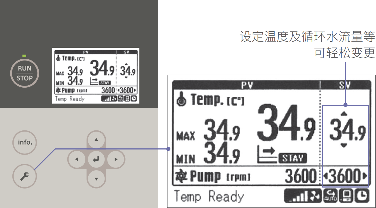 操作パネルから、循環水の設定温度や循環水の流量など、各種設定値をかんたんに変更できるので、初めてチラーを扱う方でも安心してお使いいただけます。